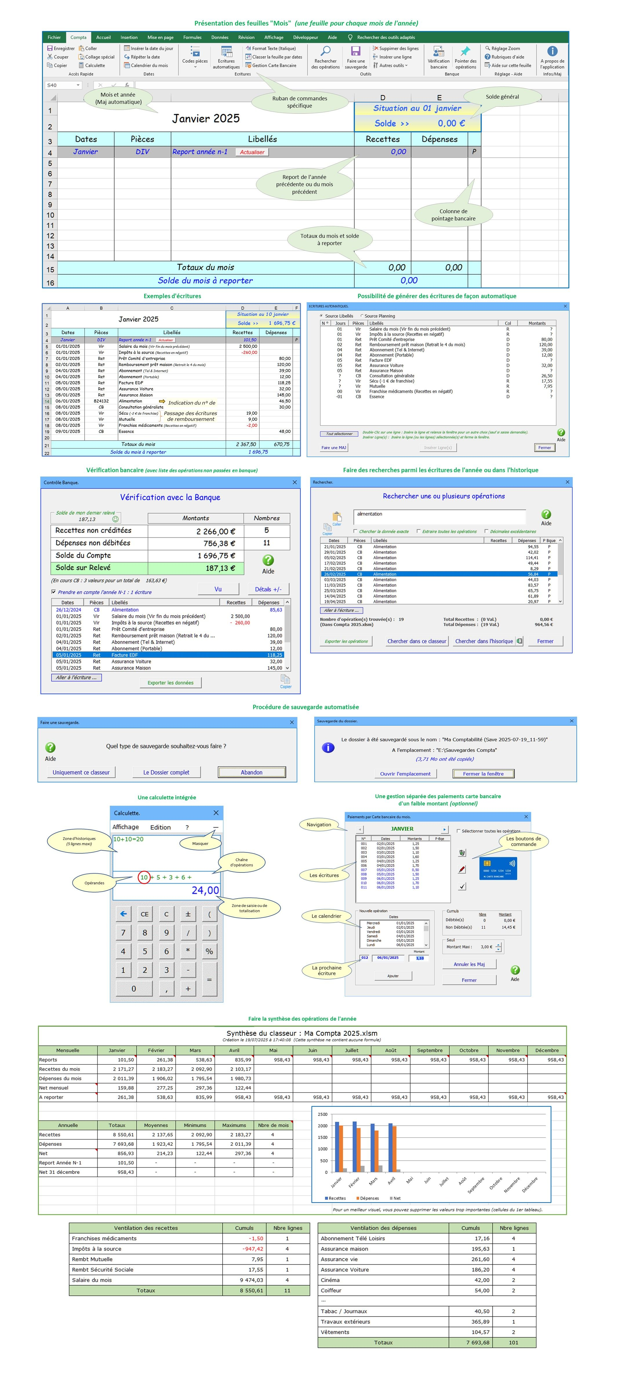 Le classeur de comptabilité constitue à lui seul une application complète pour la gestion de ses comptes. Simple d'utilisation, il va à l'essentiel; enregistrement des recettes et des dépenses, rapprochement avec le relevé bancaire et affichage permanent du solde. Il est principalement destiné aux personnes souhaitant un outil simple d'utilisation, sans paramétrage compliqué ni ventilation du type compte à compte. Son utilisation ne demande aucune compétence particulière en informatique (un minimum de connaissances de l'outil Excel est néanmoins requis).
